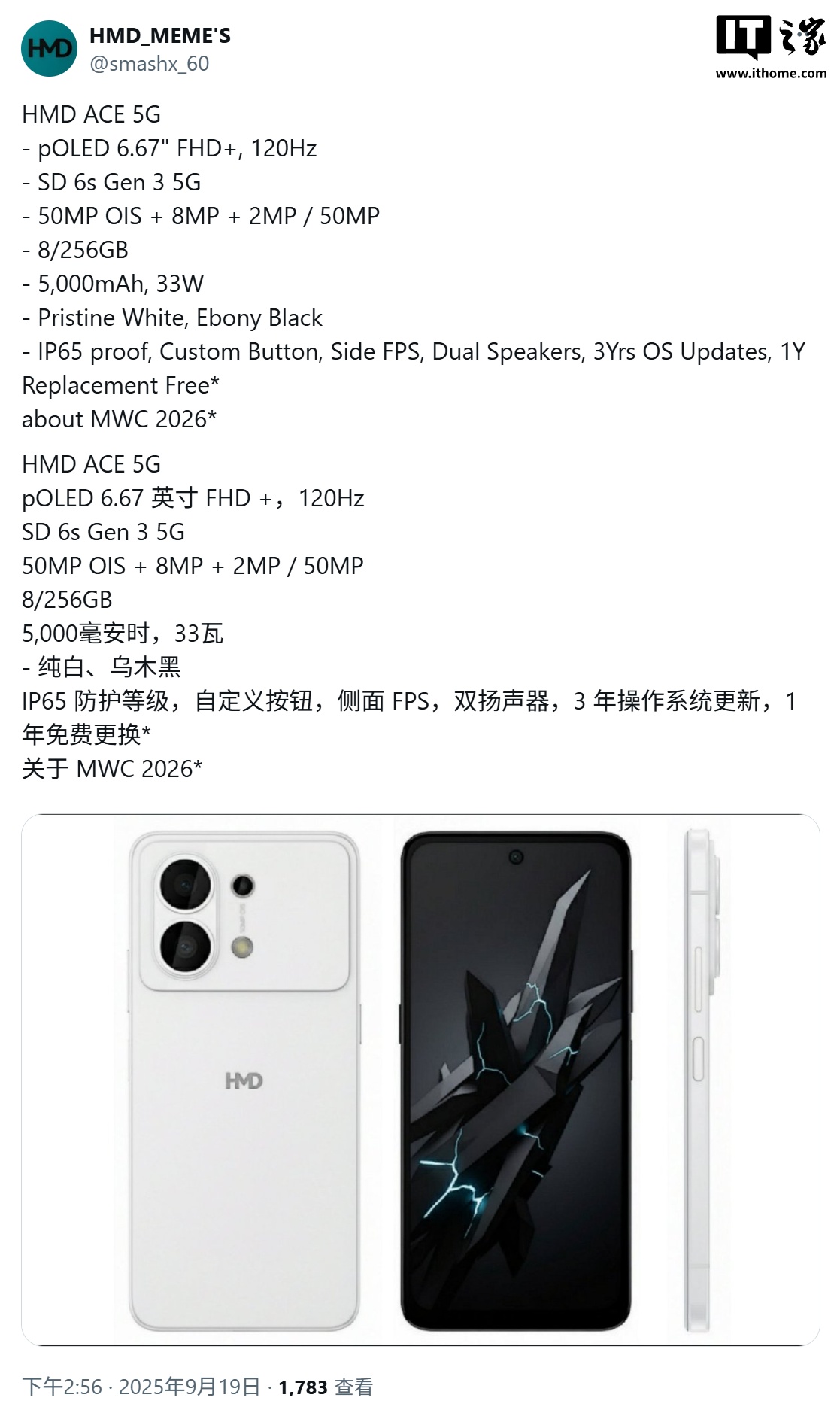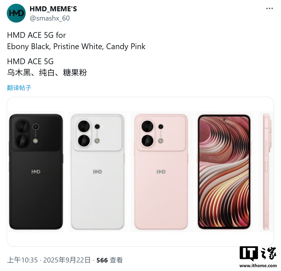 IT之家 9 月 23 日消息,科技媒体 Notebook Check 昨日(9 月 22 日)发布博文,分享了一组渲染图,展示了 HMD Global 的 Ace 5G 手机,该机预估将于 MWC 2026 期间发布。
