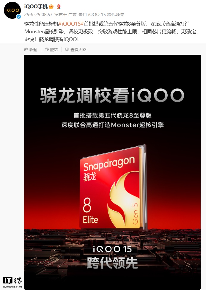 iQOO 手机官方刚刚宣布,iQOO 15 将首批搭载第五代骁龙 8 至尊版,深度联合高通打造 Monster 超核引擎,号称“相同芯片更流畅、更稳定、更快”,定位“骁龙性能压榨机”。