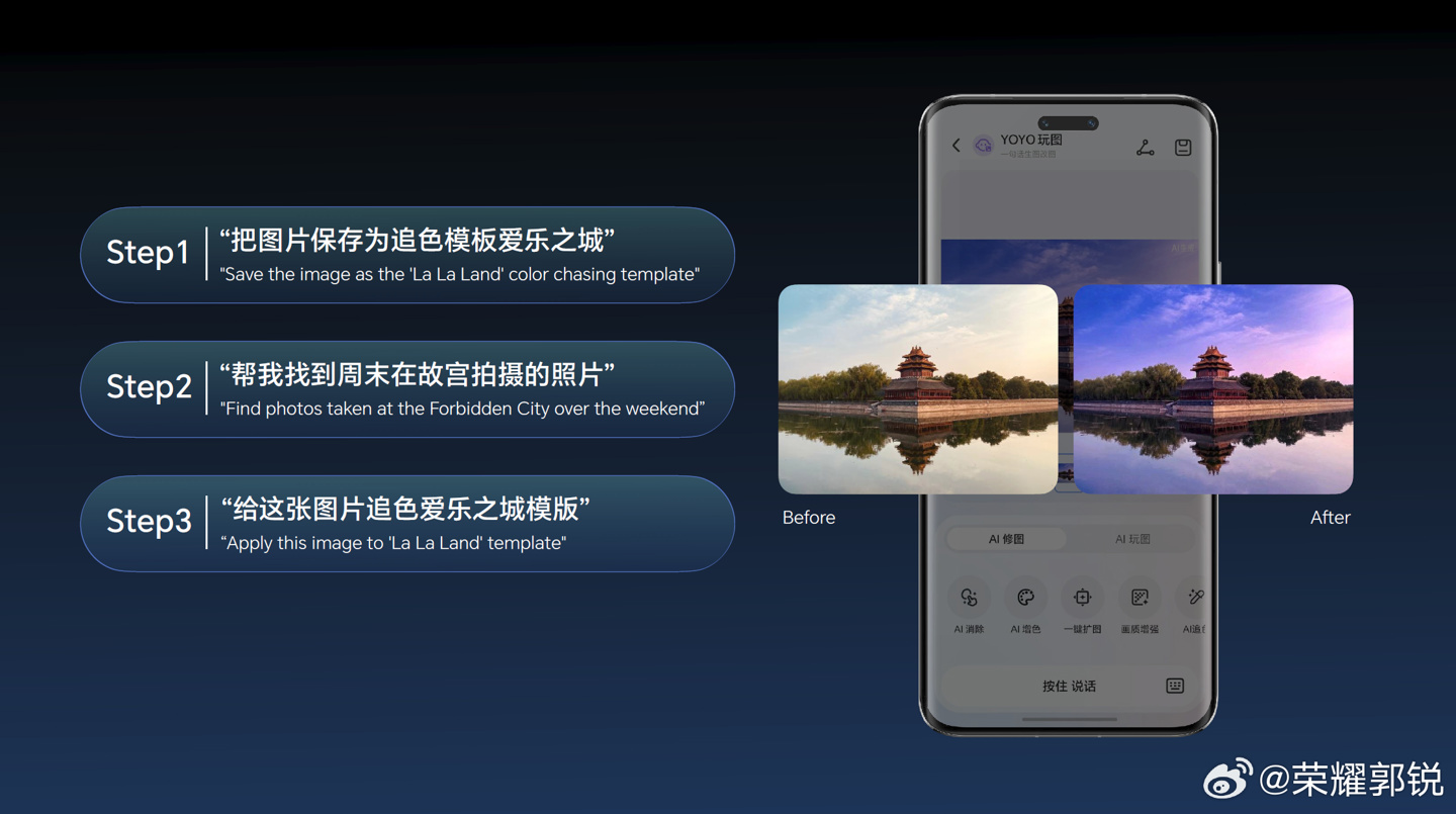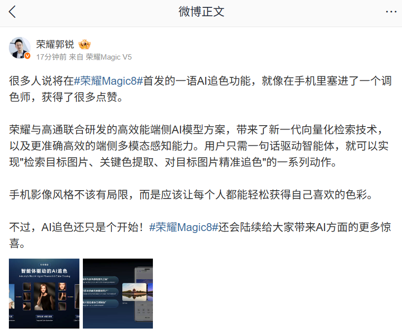 IT之家 9 月 25 日消息,荣耀终端股份有限公司品牌营销总裁、集团首席营销官郭锐今日发文透露,Magic8 手机将首发一语 AI 追色功能。