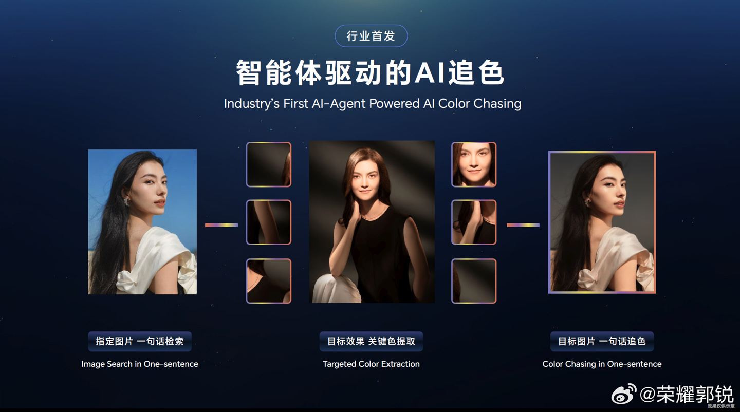 据介绍,荣耀与高通联合研发的高效能端侧 AI 模型方案,带来了新一代向量化检索技术,以及更准确高效的端侧多模态感知能力。用户只需一句话驱动智能体,就可以实现“检索目标图片、关键色提取、对目标图片精准追色”的一系列动作。