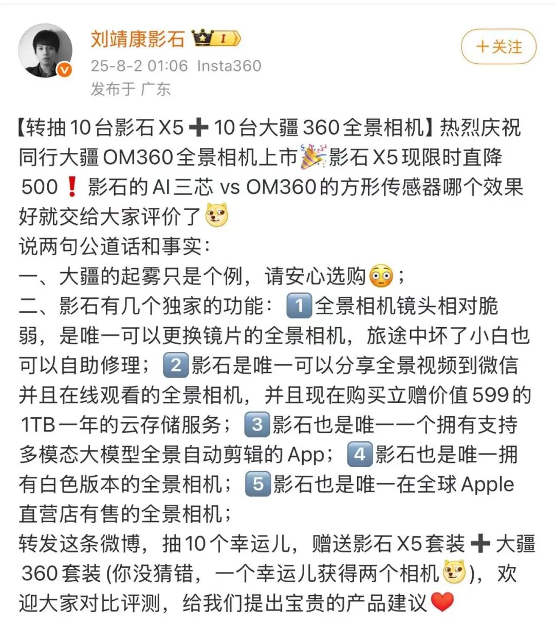 刘靖康对同行有深刻的洞察和清醒的判断,也足够开放和自信。当大疆推出全景相机Osmo 360,进入到影石的核心腹地时,他在社交媒体上公开发文“欢迎竞争,让市场更繁荣”。同时,他也毫不犹豫地顺势营销,宣布自家产品降价500元。