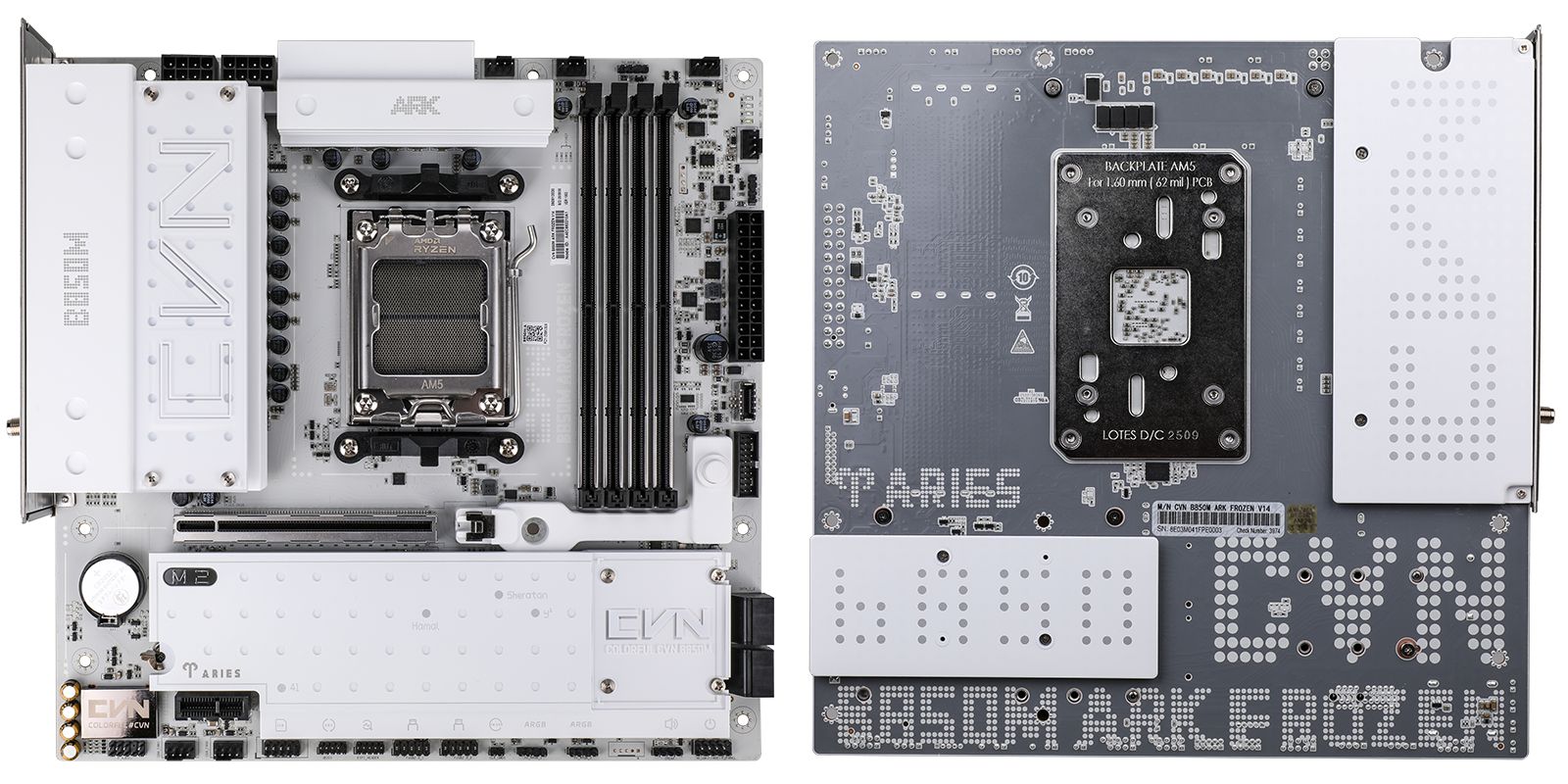 该主板代号“白羊座”,采用白色 PCB + 黑色元器件的配色组合,搭载全覆盖式冷凝片寒霜散热装甲,外观上配以点阵装饰元素,反面部分区域覆盖保护性背板。