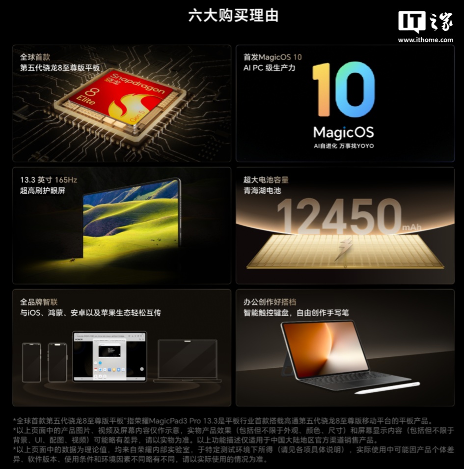 IT之家注意到,荣耀 MagicPad3 Pro 13.3 英寸平板已上架官网,并公布了部分产品信息,包括配色和主要卖点等,具体如下: