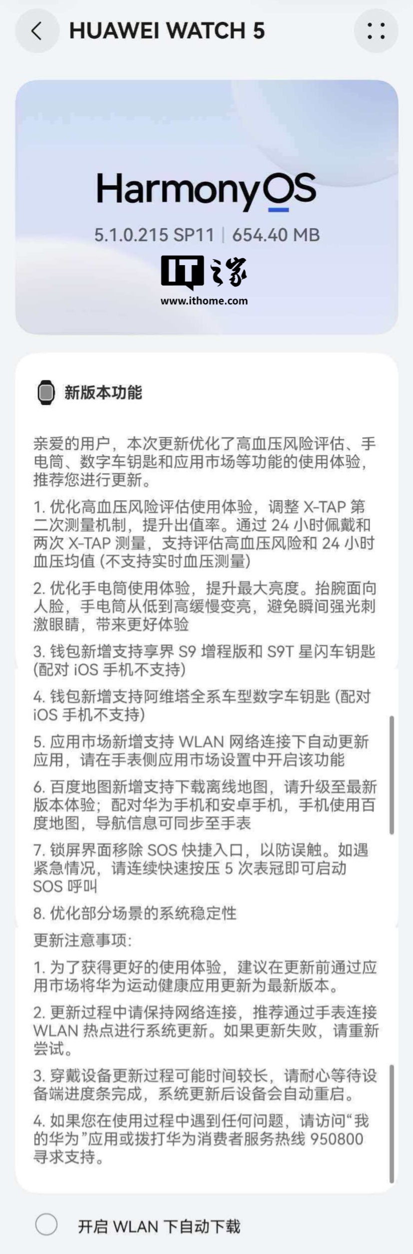 IT之家 9 月 29 日消息,华为 WATCH 5 智能手表现开启鸿蒙 HarmonyOS 5.1.0.215 SP11 版本升级,系统包大小约 654.40 MB。据介绍,本次更新优化了高血压风险评估、手电筒、数字车钥匙和应用市场等功能的使用体验。