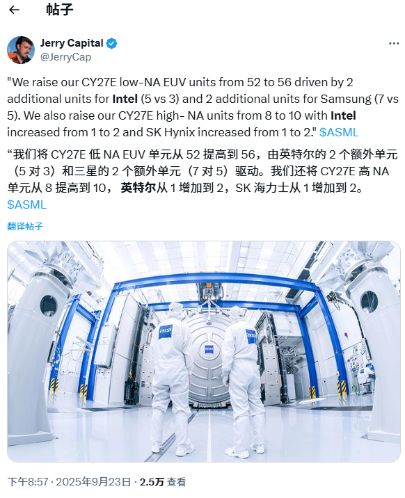 High NA EUV光刻机被称为芯片市场上的“圣杯”,这不仅是因为其高昂的价格,还因为其光刻质量。Jerry Capital的一篇分析文章披露,英特尔计划从ASML采购2台High NA EUV光刻机,比之前多购1台,这意味着英特尔将加大对未来工艺的芯片制造支出。