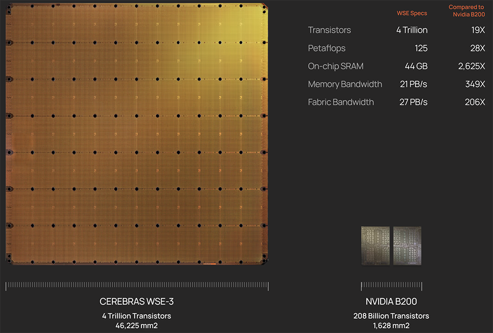该公司构建的晶圆级引擎3(WSE-3)是迄今全球最大的AI芯片,采用5nm制程工艺,面积为46225平方毫米,包含4万亿颗晶体管,通过90万个AI优化核心提供125PFLOPS的AI算力——是英伟达B200晶体管数量的19倍、AI算力的28倍。