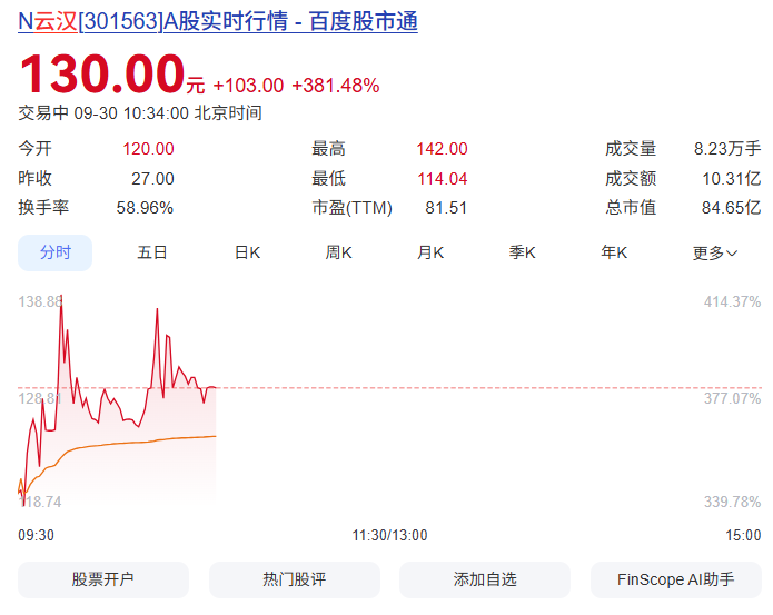 9月30日,云汉芯城正式登陆深交所创业板,开盘后股价一路飙升,截至发稿实时股价为130元,较发行价上涨381.48%,总市值为84.65亿元。