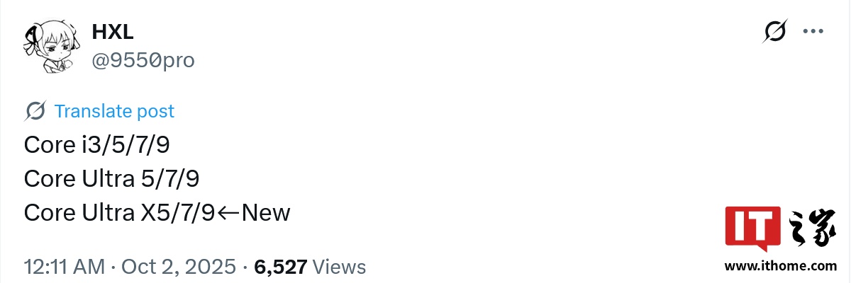 IT之家 10 月 2 日消息,X 平台消息人士 HXL (@9550pro) 爆料称,英特尔将推出全新的酷睿 Ultra X 处理器产品线,包含 Ultra X5 / X7 / X9 三个等级。