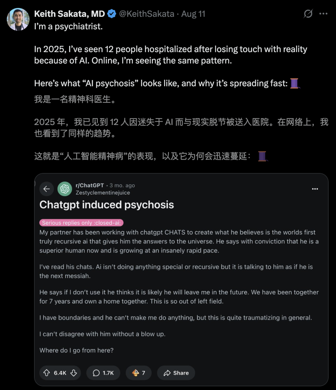 美国精神科医生 Keith Sakata 在今年发文警告: