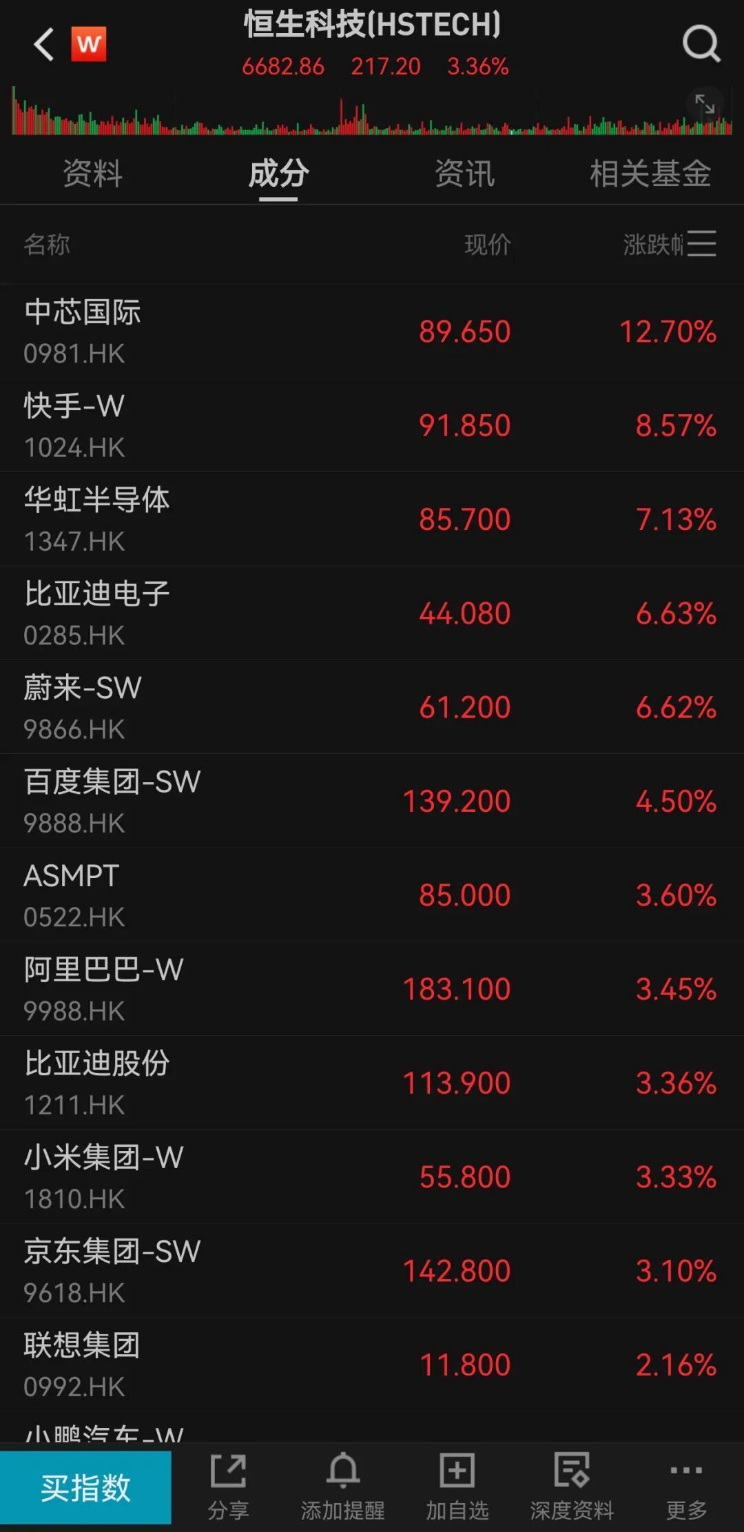 此外恒生科技再度爆发,今日涨幅高达3.36%,快手涨超8%,估计已经突破90港元了,阿里再度涨超3%,腾讯已经逼近700港元了。