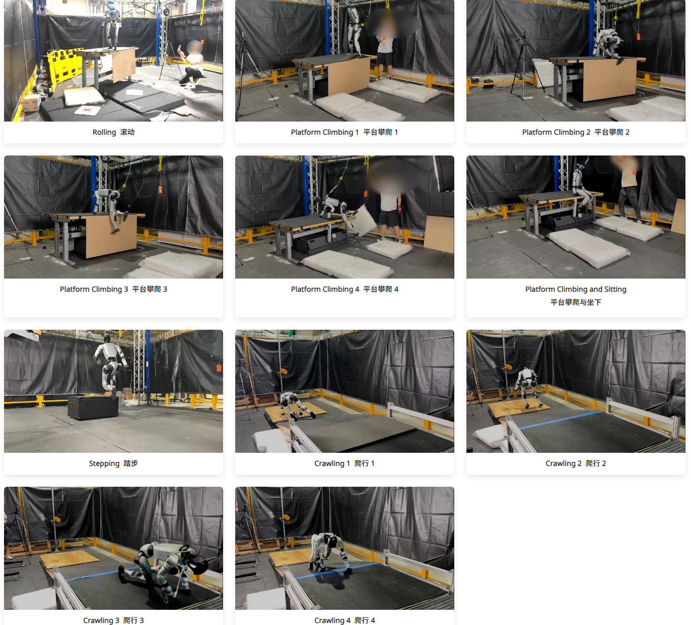 该团队放出了多个演示案例,包括翻滚、爬桌子、跳上小箱子、爬行等。