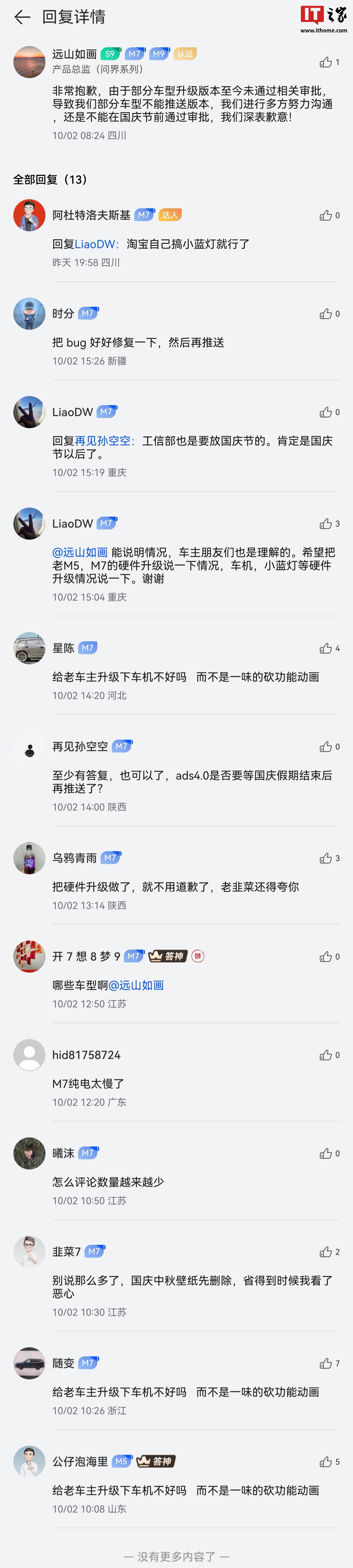 IT之家注意到,问界系列产品总监 10 月 2 日在鸿蒙智行 App 发文致歉,称部分车型升级版本至今未通过相关审批,导致部分车型不能推送版本,进行多方努力沟通还是不能在国庆节前通过审批(评论区有 M7 车主用户称是 ADS 4 未推送)。