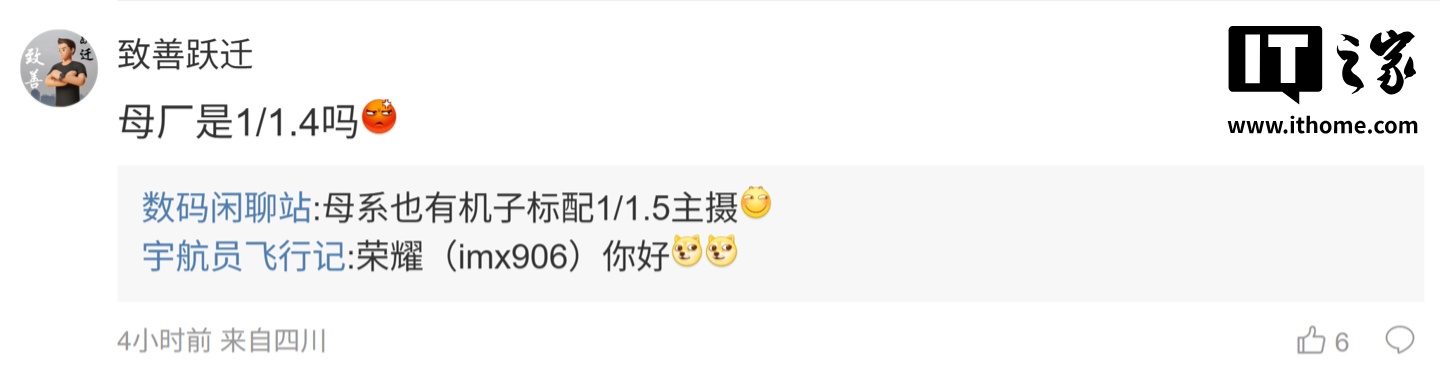 ”,博主则回复道:“母系也有机子标配 1/1.5 主摄