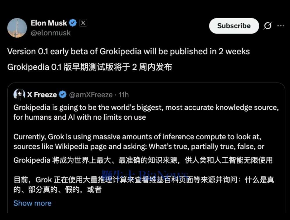 Elon Musk再一次引爆AI圈。就在刚刚,他在X上宣布——Grokipedia的0.1版本将在两周内发布测试版(early beta)。