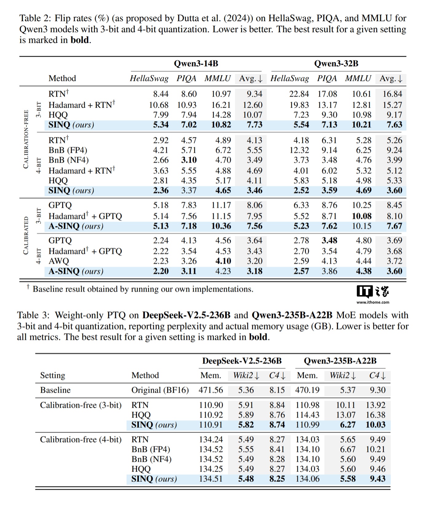 在性能评估中,SINQ 的表现全面超越了多种主流的免校准量化方法(如 RTN、HQQ)。在处理 Qwen3、LLaMA 等多种主流模型时,SINQ 在 WikiText2 等标准测试集上显著降低了模型的困惑度(Perplexity),其性能表现接近甚至达到了需要数据校准的方案水平。