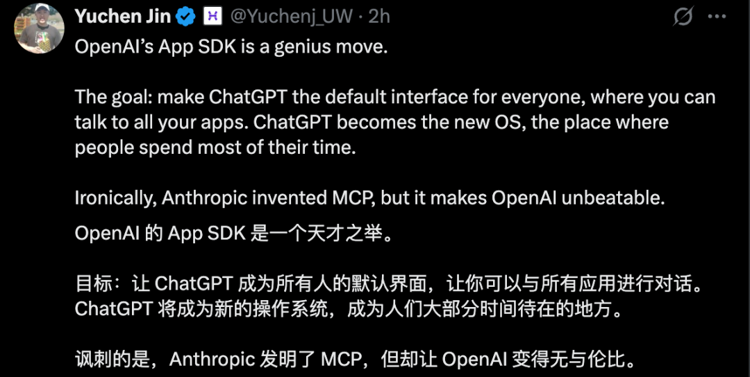1.在 ChatGPT 内部构建应用 :Apps inside ChatGPT,OpenAI推出自己的App SDK。这可以说是惊雷消息,OpenAI不但要革苹果Appstore的命,还要直接把ChatGPT变为操作系统,看大神怎么说: