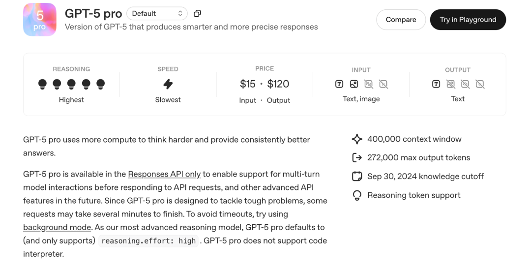它的训练截止时间是2024年9月30日,400k上下文窗口,最大支持272k token输出。