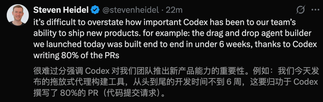 就比如,在Codex加持下,拖放搭建智能体工具从0开发仅用6周完成。