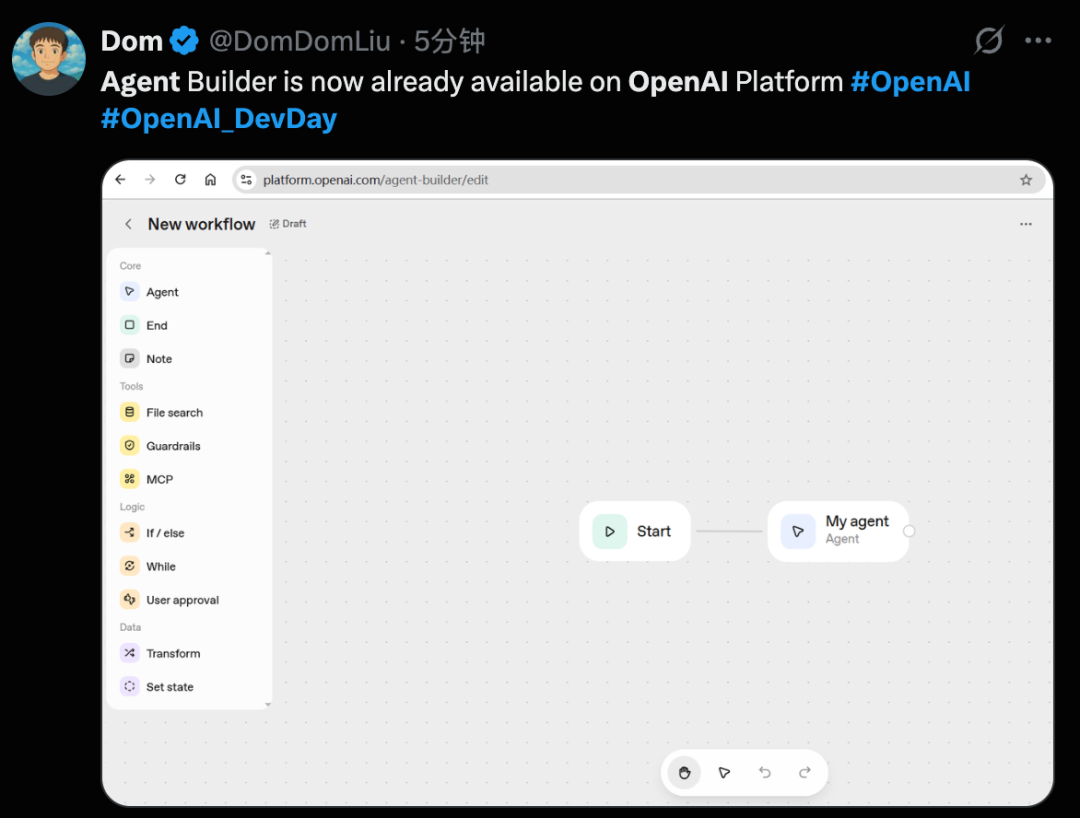 Agent Builder是一个全新的可视化拖拽平台,AI智能体的构建流程就像搭积木一样简单!