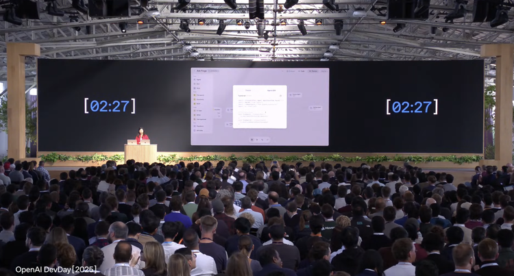 回到这次DevDay上,OpenAI发布了Apps SDK(在ChatGPT内构建应用的完整框架)、AgentKit(快速构建AI Agent的工具套件)、Codex正式版以及GPT-5系列和Sora2等模型的API。Sam Altman开场公布了一组增长数据,开发者数量从2023年的200万增长到400万,翻了一番。ChatGPT的周活跃用户从1亿飙升至8亿,增长了8倍;API每分钟处理的token量从3亿暴涨到60亿,这是20倍的增长。