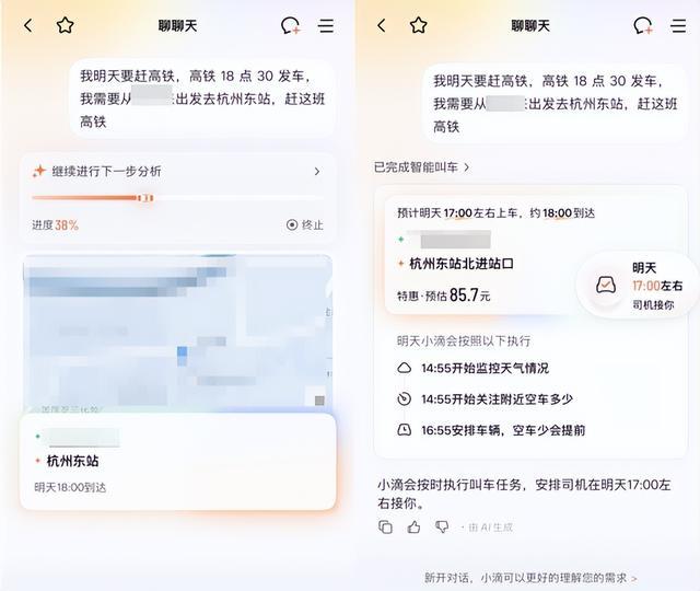 再比如 “ 我明天要赶 18 点 30 的高铁 ”,它能结合时间、天气和路况,帮你预估出发时间来约这个车。