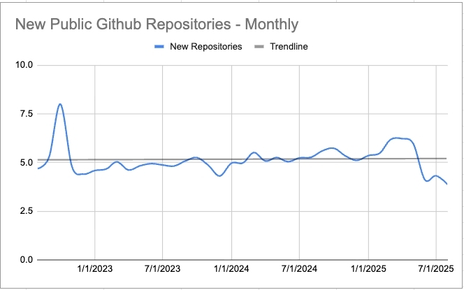 试想一下:凭借你对 AI 辅助编程及其广泛应用的所有了解,如果我给你看全球新软件发布的图表,你预期那图表的曲线会是什么形状?你肯定以为会看到一条随着 AI 被采用、人们产出更多而“指数级增长、一路扶摇直上”的曲线吧?