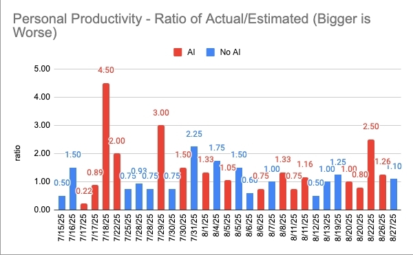 我发现,这些数据在任何有意义的层面上都不具备统计显著性。我需要再记录四个月的新数据点,才能证明 AI 到底是在让我提速还是在拖慢我。但目前情况实在是太均势了。