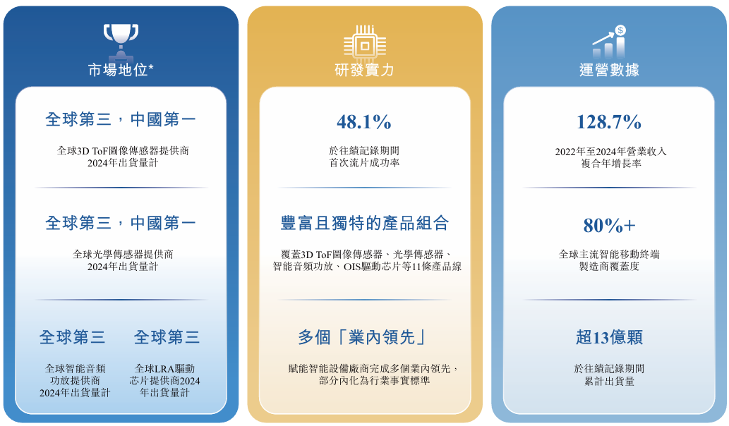 聚芯微电子以高性能数模混合信号芯片与优化算法为核心,构建“感知-决策-执行”闭环,为机器人、物联网、移动智能设备、数字孪生及汽车电子等高增长场景提供关键驱动力。根据灼识咨询数据,2024年公司在全球光学传感器、智能音频功放、LRA驱动芯片、3D ToF图像传感器等四大细分市场均位列前三,市场份额分别为11.2%、8.3%、4.1%及1.6%,影像技术芯片出货量全球第七。
