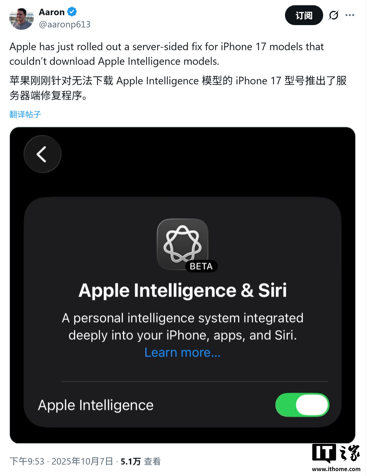 IT之家 10 月 8 日消息,科技媒体 9to5Mac 昨日(10 月 7 日)发布博文,报道称苹果通过服务器端更新,修复了少数 iPhone 17、iPhone Air、iPhone 17 Pro 和 iPhone 17 Pro Max 用户无法下载 Apple 智能(Apple Intelligence)模型的问题。