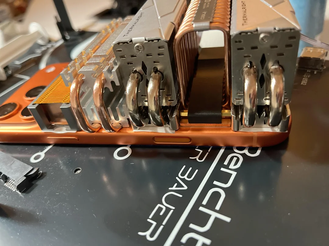 他将一套常用于个人电脑的 M.2 SSD 导热管散热器,通过夹具固定在一部 iPhone 17 Pro Max 的机身背面,构建了一个虽然笨重但效果显著的外部被动散热系统。