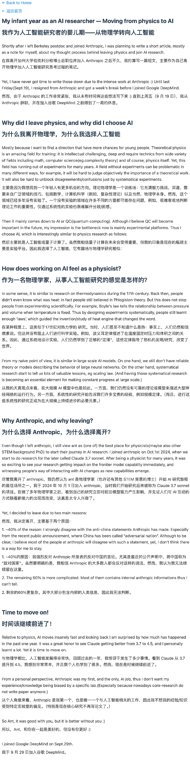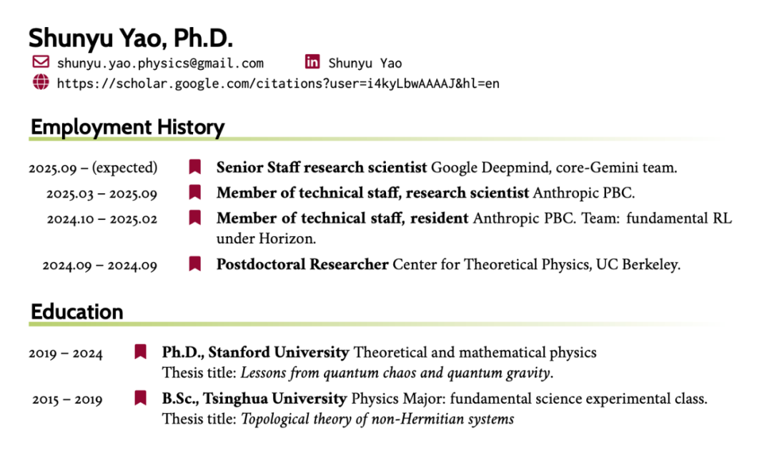 虽然姚顺宇认为 Anthropic 是物理学家进入 AI 研究的最佳起点之一,但他还是在 9 月 19 日从 Anthropic 正式离职,9 月 29 日加入 Google DeepMind。