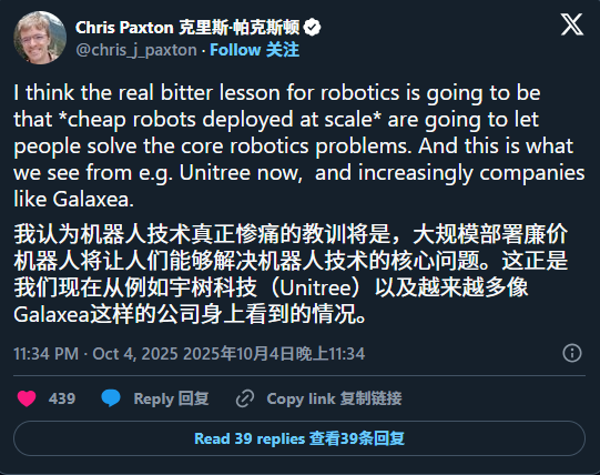 知名机器人研究员克里斯・帕克森(Chris Paxton)在转发相关帖子时评论道:“我认为机器人技术真正惨痛的教训将是,大规模部署廉价机器人将让人们能够解决机器人技术的核心问题。这正是我们现在从例如宇树科技以及越来越多像 Galaxea 这样的公司身上看到的情况。。”