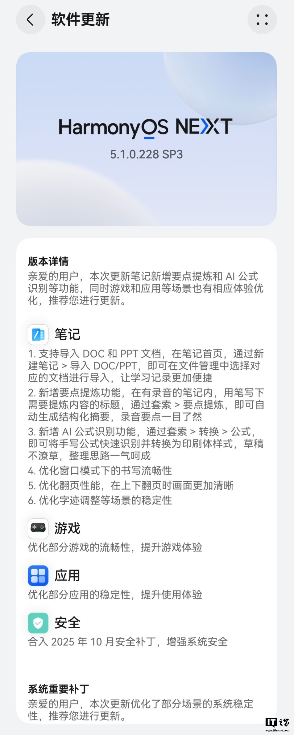IT之家 10 月 9 日消息,华为 MatePad Mini 平板现已推送鸿蒙 5.1.0.228 SP3 更新,主要为系统自带的笔记 App 增添要点提炼、AI 公式识别等功能,并修复各种小问题。