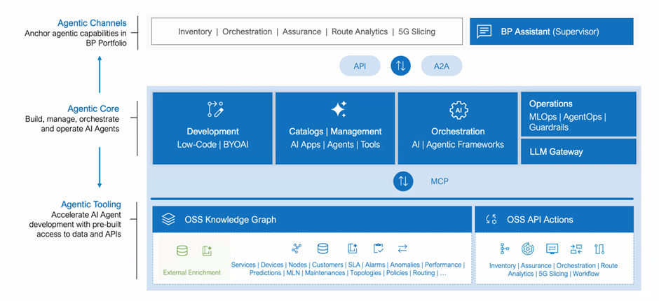 Blue Planet 提出的方案是一个专为电信网络构建的Agentic AI 框架。它支持智能体基于意图行动、应用上下文,并在整个网络范围内采取协调行动。关键在于,它是在清晰且组织良好的数据模型和 API 之上实现这一点的。该框架构建于 Blue Planet 的 AI Studio 之上,这一AI Studio 于 2024 年商用发布。