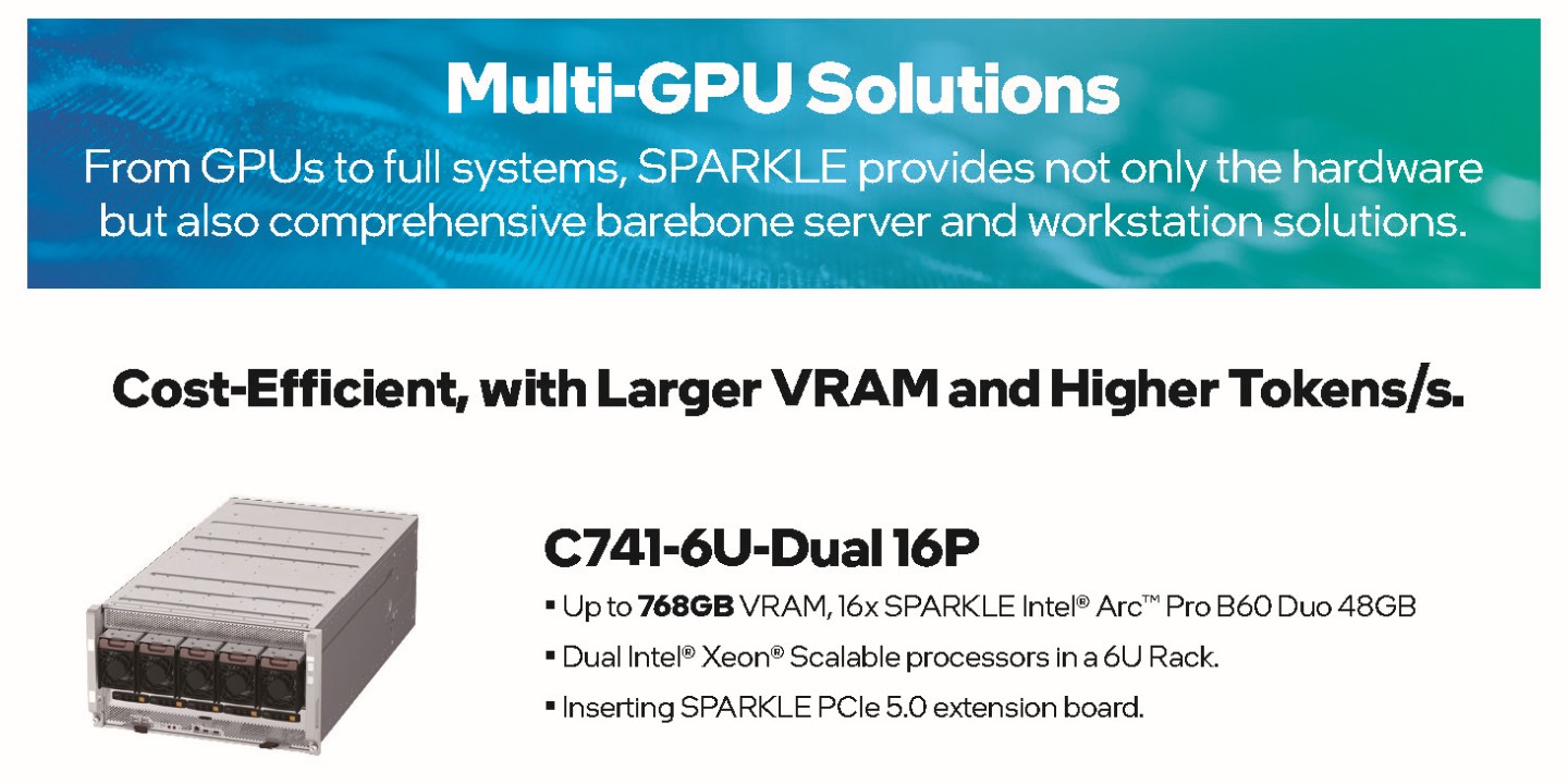这些解决方案中最引人注目的无疑是旗舰 C741-6U-Dual 16P,其配备了 16 张双芯的锐炫 Pro B60 Duo 48GB 显卡,总显存容量达到惊人的 768GB。