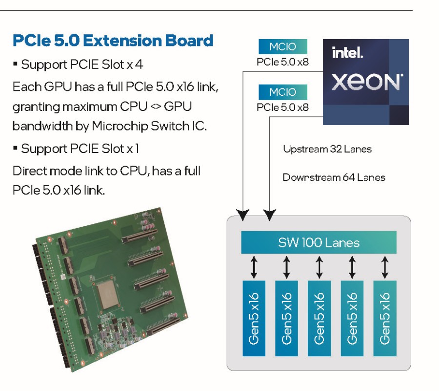 C741-6U-Dual 16P 采用机架式 6U 高度外形设计,基于双路英特尔至强 4/5 系列处理器,通过 PCIe 5.0 扩展板安装至多 16 块锐炫 Pro B60 Duo 48GB,此外其还提供了 2 条用于安装高速 NIC 有线网卡的直出 PCIe 插槽。