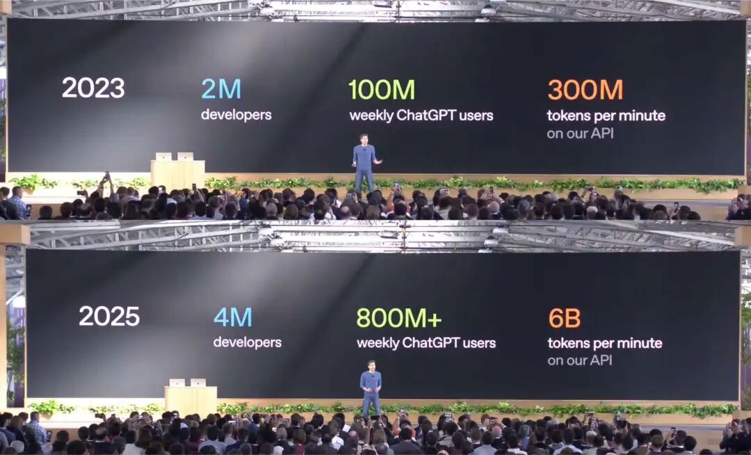 距离首届开发者日仅两年,OpenAI 的生态已经发生了翻天覆地的变化:开发者人数从 200 万增加到 400 万,ChatGPT 周活跃用户从 1 亿飙升至 8 亿,而 API 每分钟处理的 Token 数量更是暴涨 20 倍,达到了 60 亿。