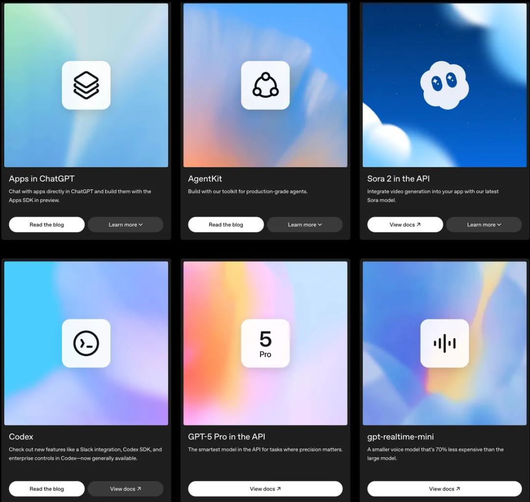 而最底层的基座,是那几款重磅模型:GPT-5 Pro API、gpt-realtime-mini 语音模型、Sora 2 视频模型。