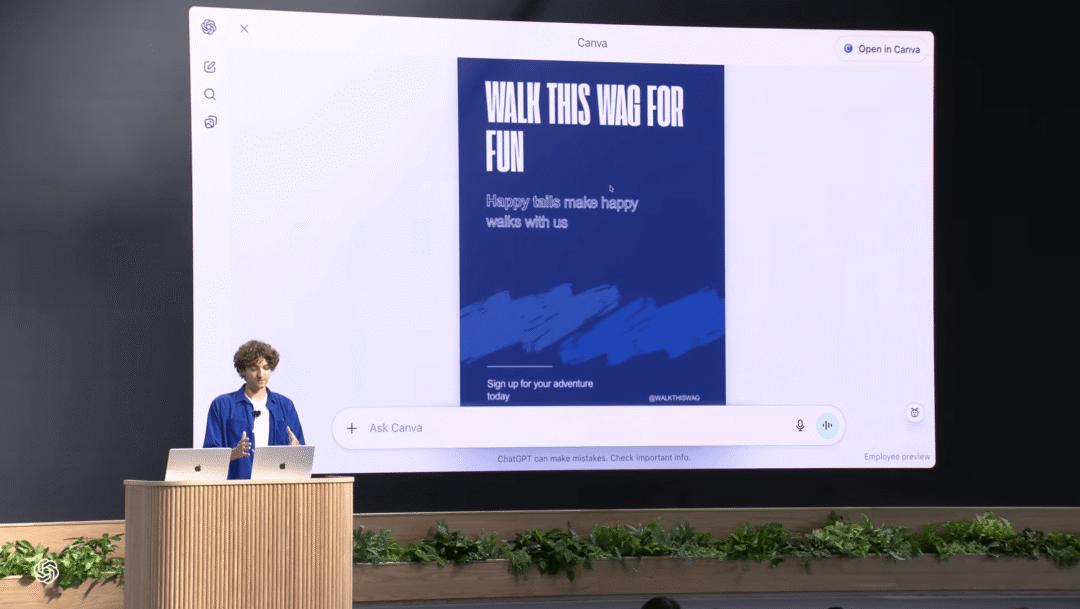 想做宣传海报?在 ChatGPT 里一句“帮我做一张海报”,它会直接 @Canva,跳出完整设计界面。
