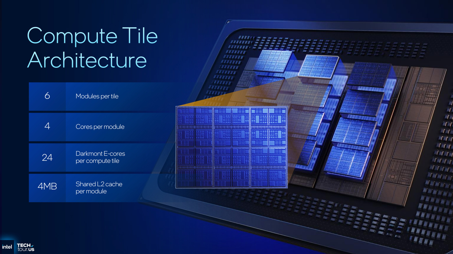 "Clearwater Forest" 的每个计算模块包括 6 个四核心簇,对应 24 个 "Darkmont" 架构 CPU 内核,相较 "Sierra Forest" 上的 "Crestmont" 在分支预测、解码宽度、执行引擎规模等方面都有提升,最终在旗舰型号实现了至高 17% 的性能提升和 30% 的能效改进。