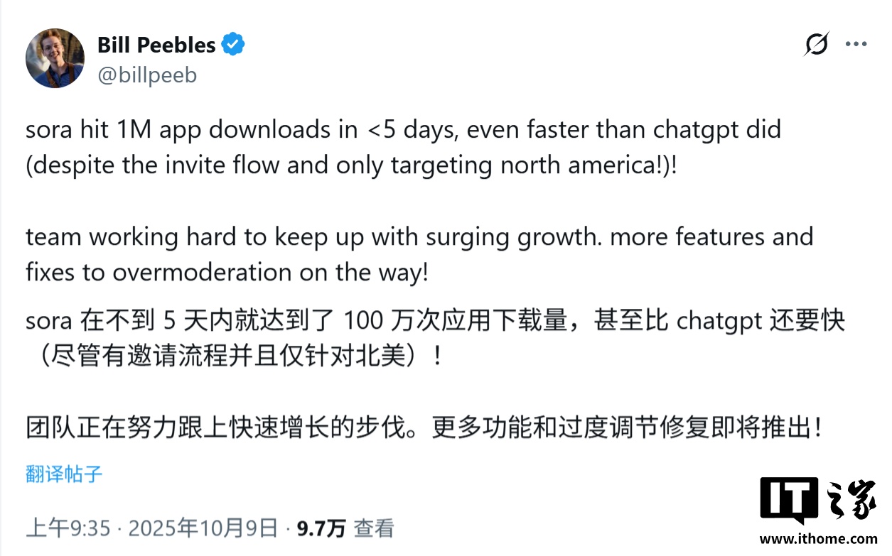 IT之家 10 月 10 日消息,OpenAI Sora 负责人 Bill Peebles 昨日(10 月 9 日)在 X 平台发布推文,宣布 Sora 应用上线不到 5 天时间,下载量已经突破 100 万次,其达成此里程碑的速度甚至超过了公司旗下的现象级产品 ChatGPT。