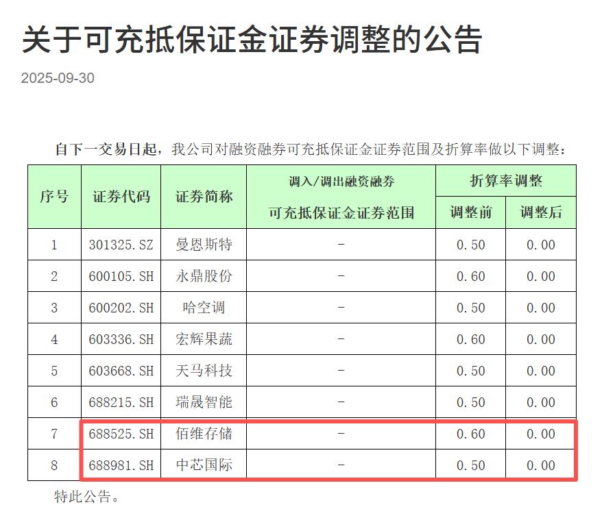 10月9日,有投资者反馈,接东方财富证券短信告知,自当日起,信用账户持有的中芯国际(688981)的两融折算率由0.7调整为0.00,佰维存储(688525)的两融折算率由0.5调整为0.00。