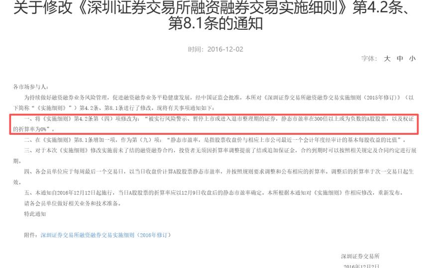 2016年12月2日,沪深两地交易所公告称,经证监会批准,近日沪深交易所对《融资融券交易实施细则》进行修订,其中,调整可充抵保证金证券折算率要求,将静态市盈率在300倍以上或者为负数的股票折算率下调为0%。