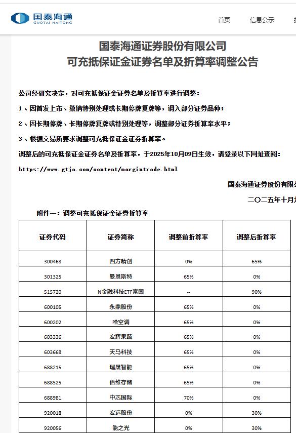 对于折算率的调整,国泰海通在公告中提到,因长期停牌、长期停牌复牌或特别处理等,调整部分证券折算率水平;根据交易所要求调整可充抵保证金证券折算率。