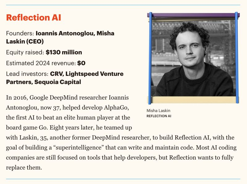八年后,他与另一位DeepMind前研究员、35岁的Misha Laskin携手创办了 Reflection AI,目标是打造一个能够编写与维护代码的超级智能系统。