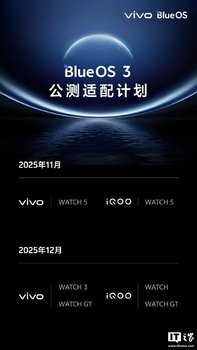 本次招募将于 11 月 3 日上午 10 点开启,11 月 7 日晚 18 点结束,首批支持机型包括 vivo WATCH 5 蓝牙版、eSIM 版及 iQOO WATCH 5 蓝牙版、eSIM 版,IT之家整理完整公测适配机型列表如下: