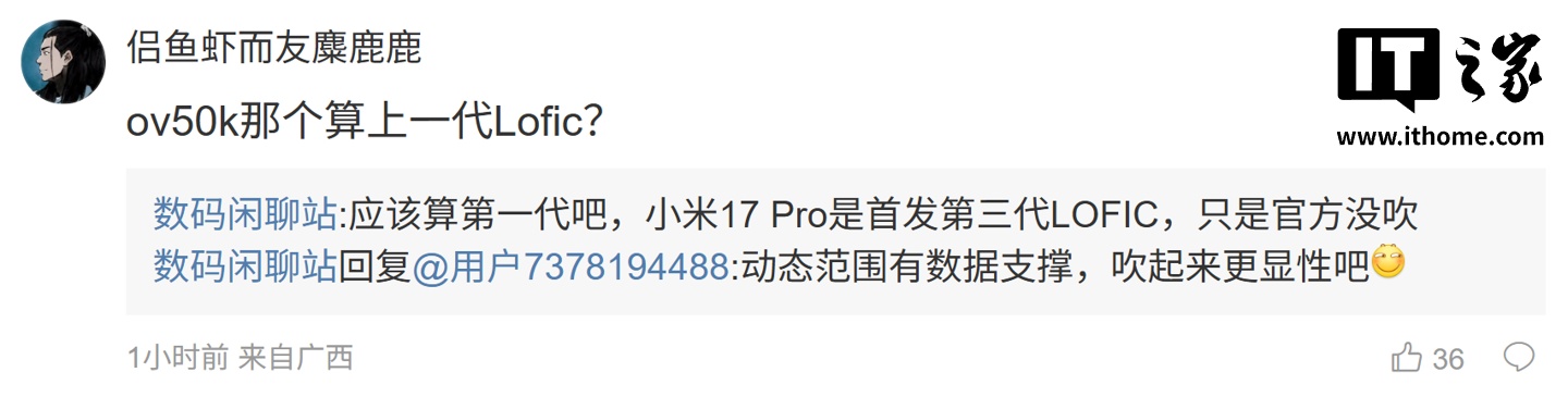 后续有用户在评论区询问:“ov50k 哪个算上一代 Lofic?”,博主回复道:“应该算第一代吧,小米 17 Pro 是首发第三代 LOFIC,只是官方没吹”;另一名用户则询问道:“各家 8850 影像超大杯都会上 LOFIC?”,博主则回复道:“目前看有 2-3 家超大杯在评估 LOFIC 传感器”。