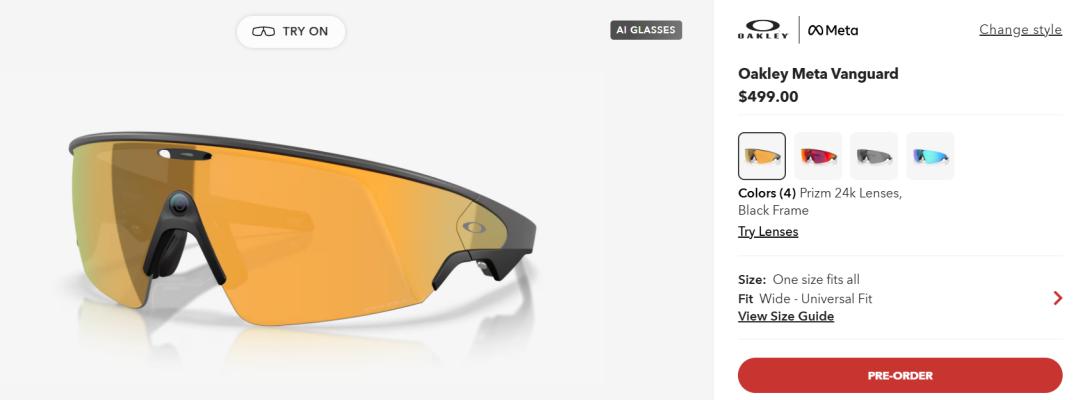 Meta还与运动品牌Oakley合作推出Oakley Meta Vanguard,定价499美元(约3550元人民币)。该产品以耐用性与运动适配为核心设计方向:IP67防尘防水等级可承受1米水深短时间浸泡;配备可更换的Oakley PRIZM镜片,可根据阳光强度、运动场景调整透光率,减少眩光影响。性能方面,该眼镜搭载中置广角镜头,支持3K视频录制与智能防抖,支持慢动作、缩时摄影模式;开放式扬声器音量较前代提升,搭配风噪抑制技术,官方称可在强风环境下保持语音指令识别清晰度。续航方面,混合使用可达9小时,搭配充电盒可延长至36小时。新品支持与运动平台联动,用户可通过语音查询实时运动数据,眼镜可自动录制运动中突破个人纪录的片段;右眼上方的LED指示灯可在心率偏离目标区间时变红,辅助运动监测。