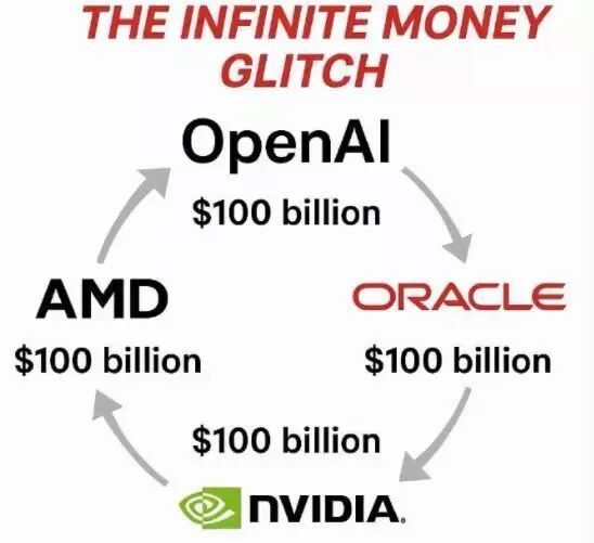 大家发现,原来OpenAI、英伟达、AMD以及Oracle之间,存在这么一个互相投资,互相购买服务的套娃结构。