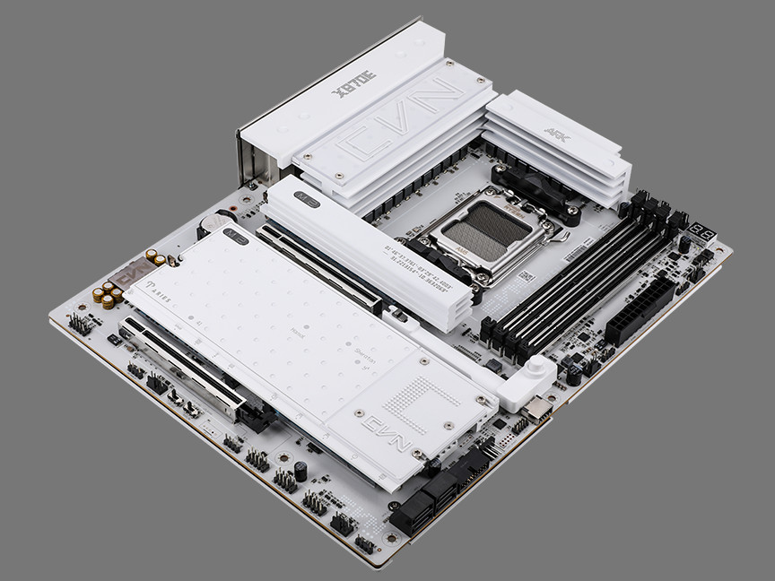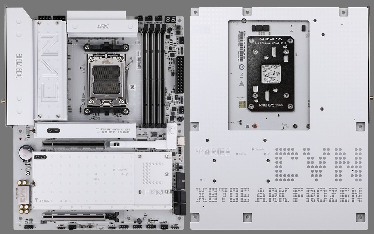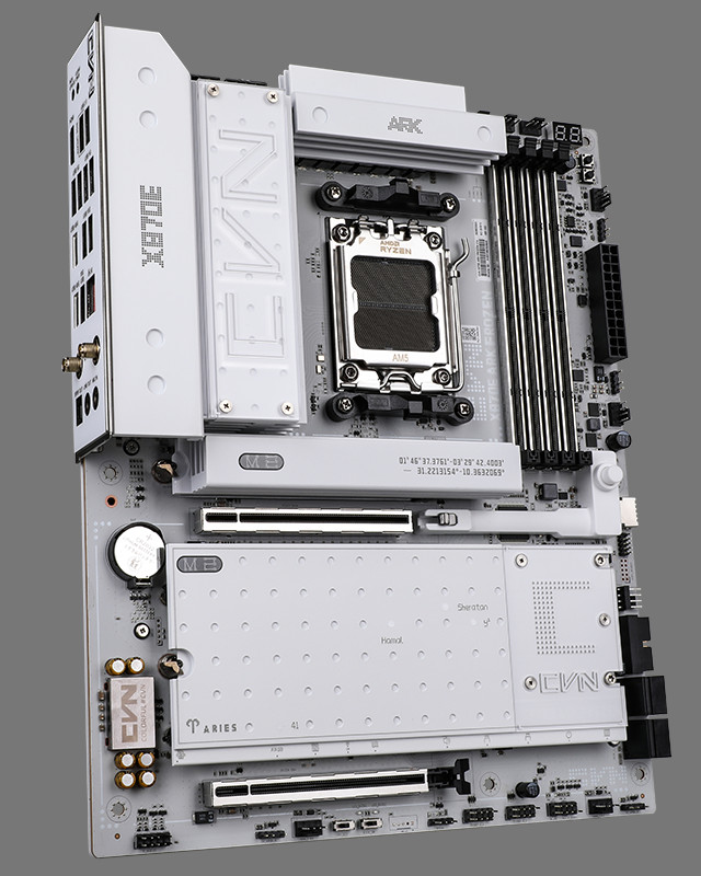 CVN X870E ARK FROZEN V14 主板采用 ATX 板型,整体采用白色 PCB,配备 CVN“白羊座”寒霜散热装甲,通过全覆盖式冷凝片强化散热,还拥有一块全尺寸的防护背板。